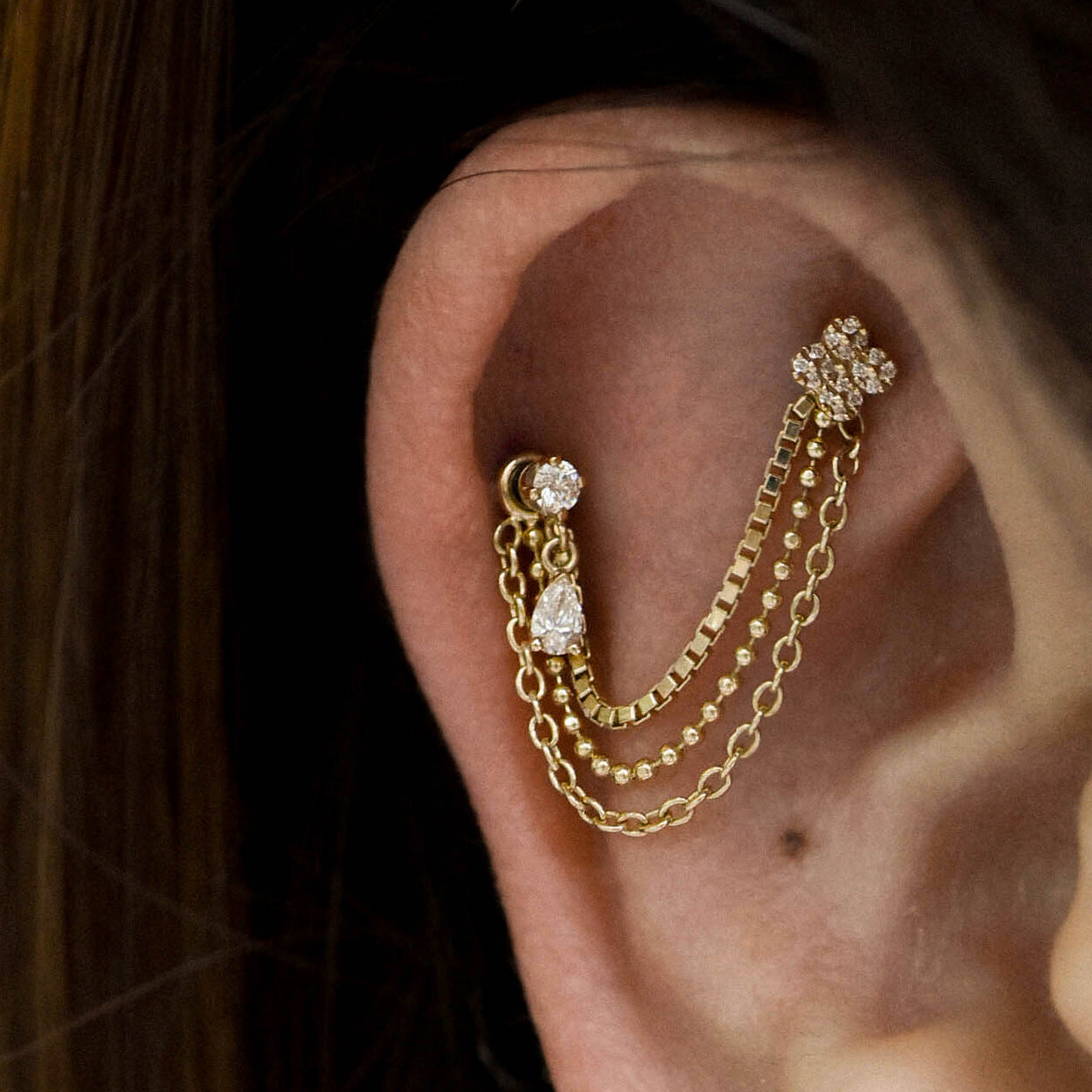 1 Round four prong setting and 1 Pear V prongs setting with 2x links of 1mm cable chain