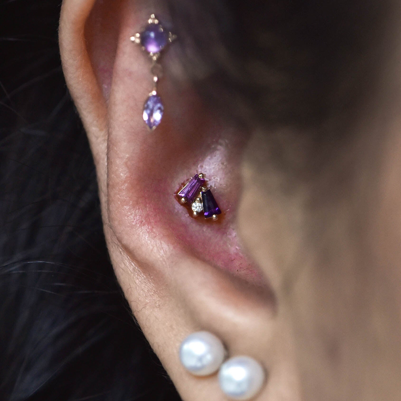 Featuring tapered cut baguettes and a unique design, this piece is modern and adds a pop of color. Perfect for those who want a classic with a twist.