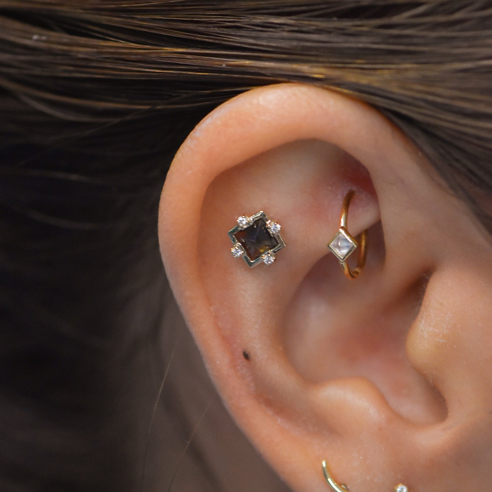 14k Gold with Smoky Quartz, Green Agate, and White Cubic Zirconia Threadless End