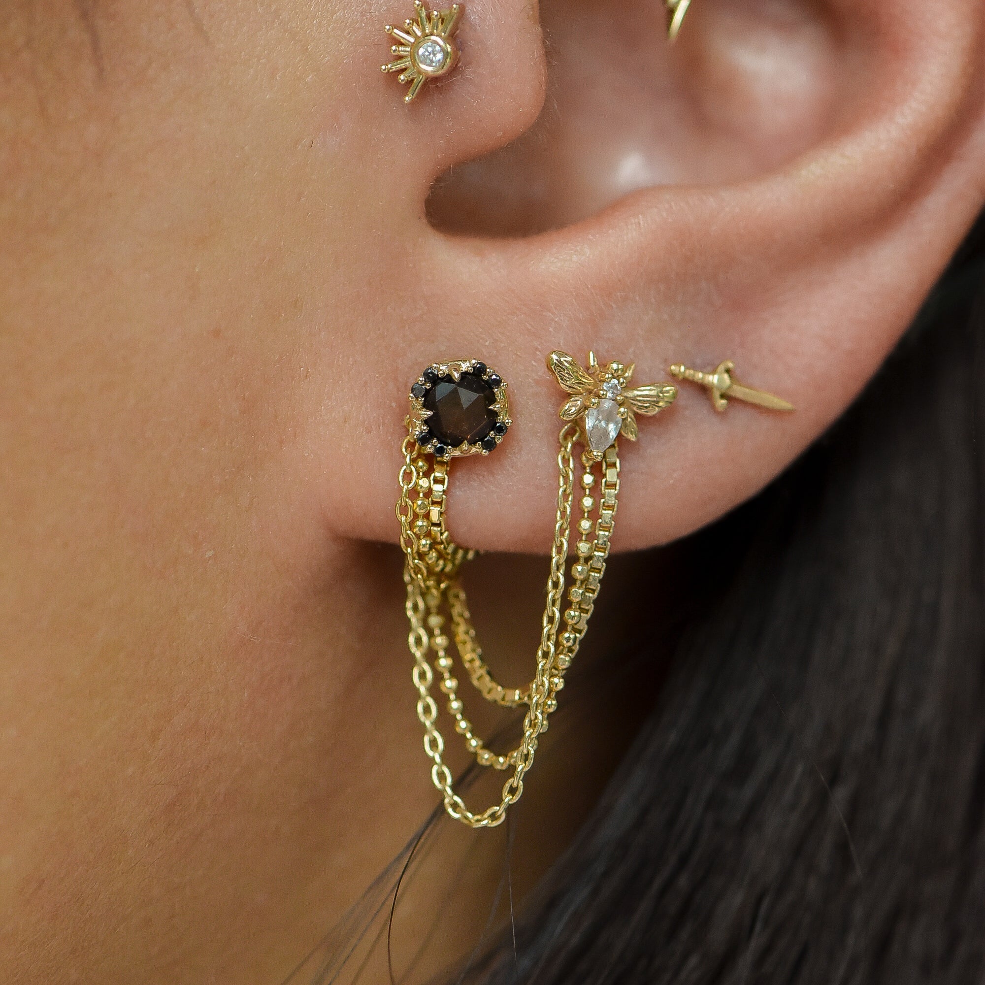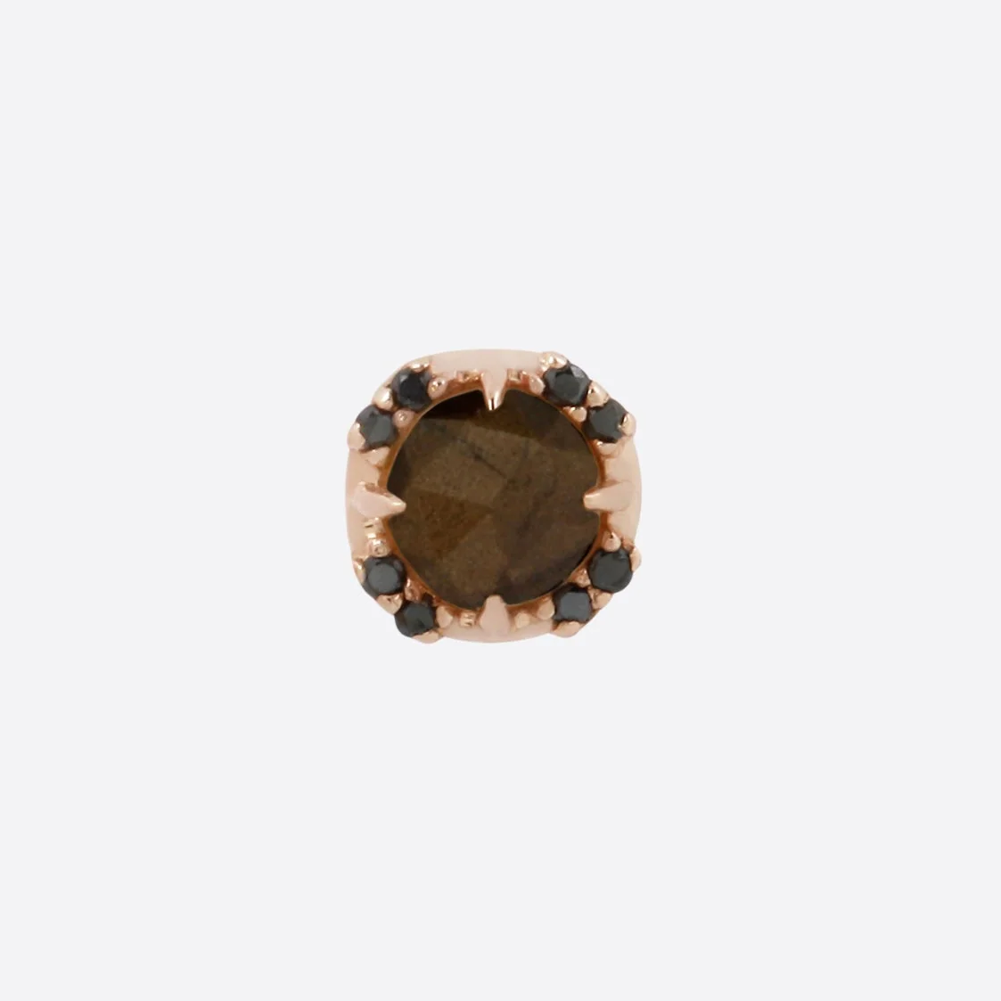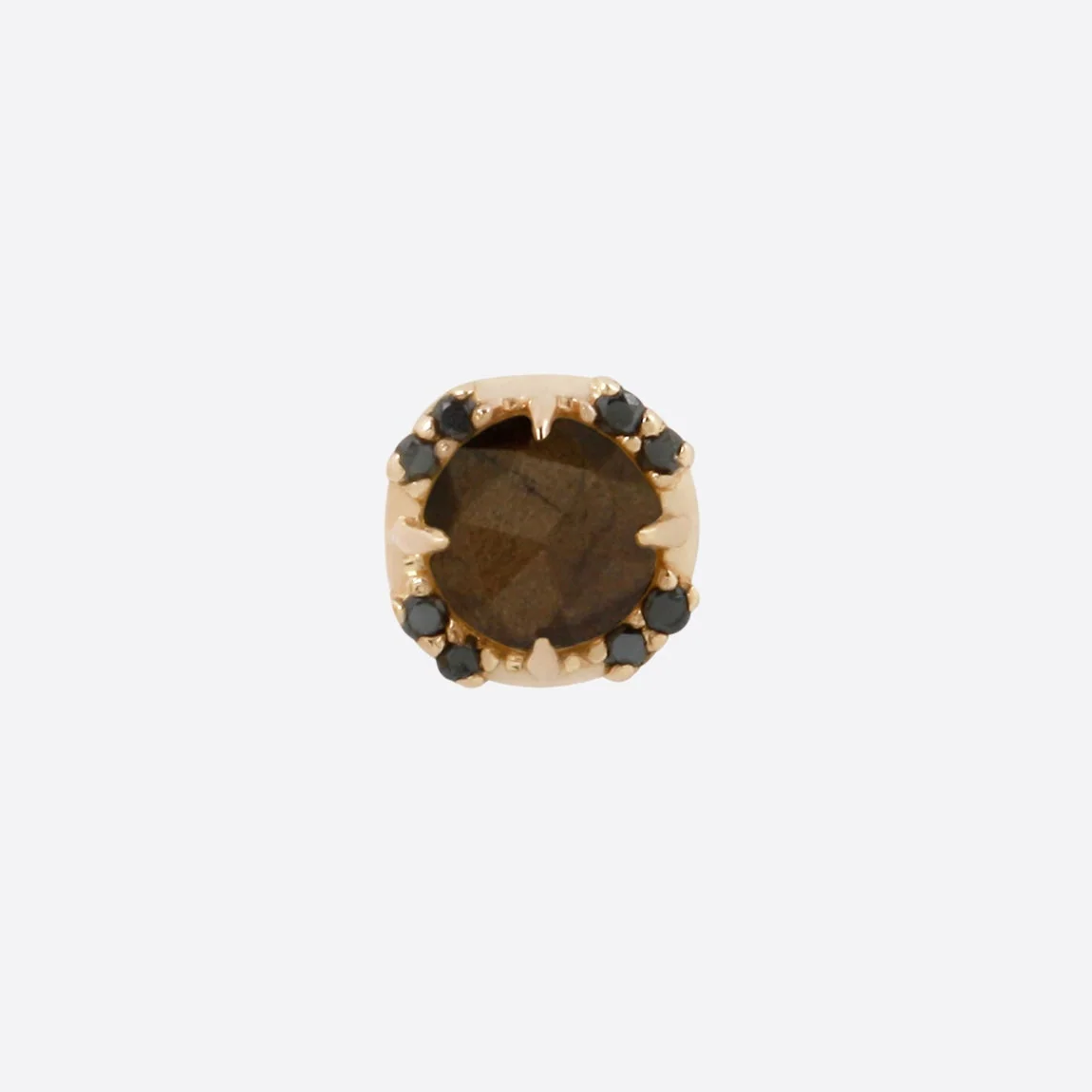 The Galaxia is a stunning prong setting with a custom rose-cut Zawadi Sapphire surrounded by eight genuine black diamonds. Zawadi Sapphires are found in Kenya and "Zawadi" is a Swahili word meaning gift. These stones are untreated and the chatoyant sheen is naturally caused by the internal patterns of rutile and hematite in line with the natural growth structure of the sapphire crystal.