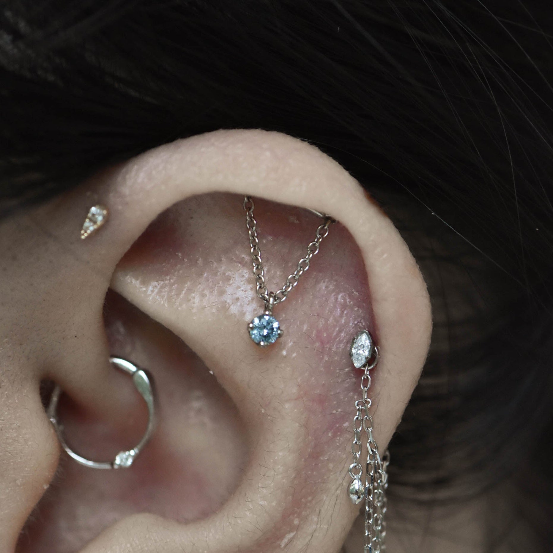 Glide creates an elegant chain drape perfect for a hidden helix piercing. It is handcrafted with extreme care and attention to detail. All jump rings and chains are permanently fixed for additional comfort and stability.