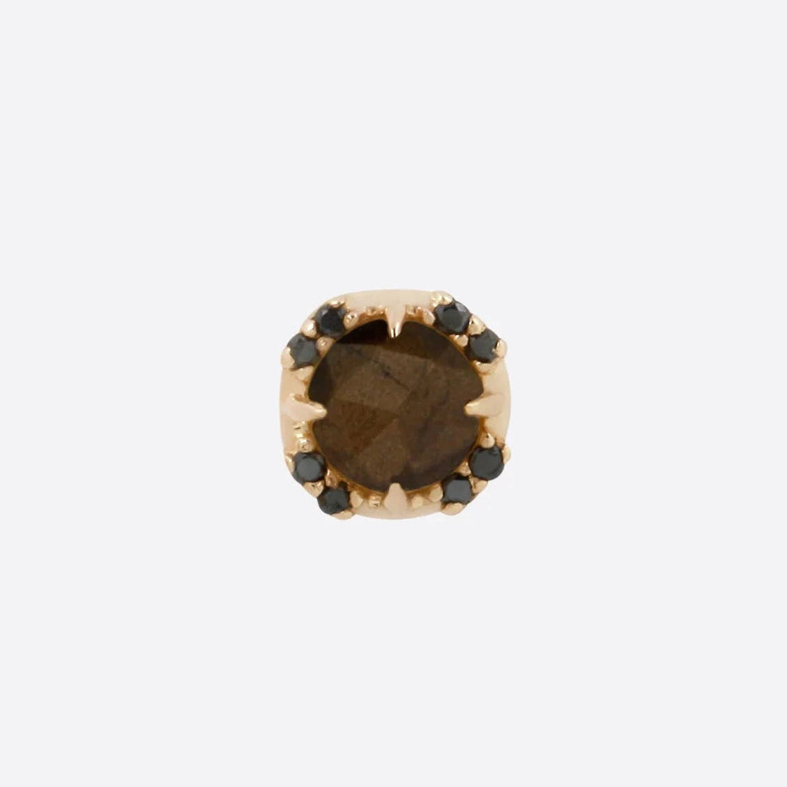 The Galaxia is a stunning prong setting with a custom rose-cut Zawadi Sapphire surrounded by eight genuine black diamonds. Zawadi Sapphires are found in Kenya and "Zawadi" is a Swahili word meaning gift. These stones are untreated and the chatoyant sheen is naturally caused by the internal patterns of rutile and hematite in line with the natural growth structure of the sapphire crystal.