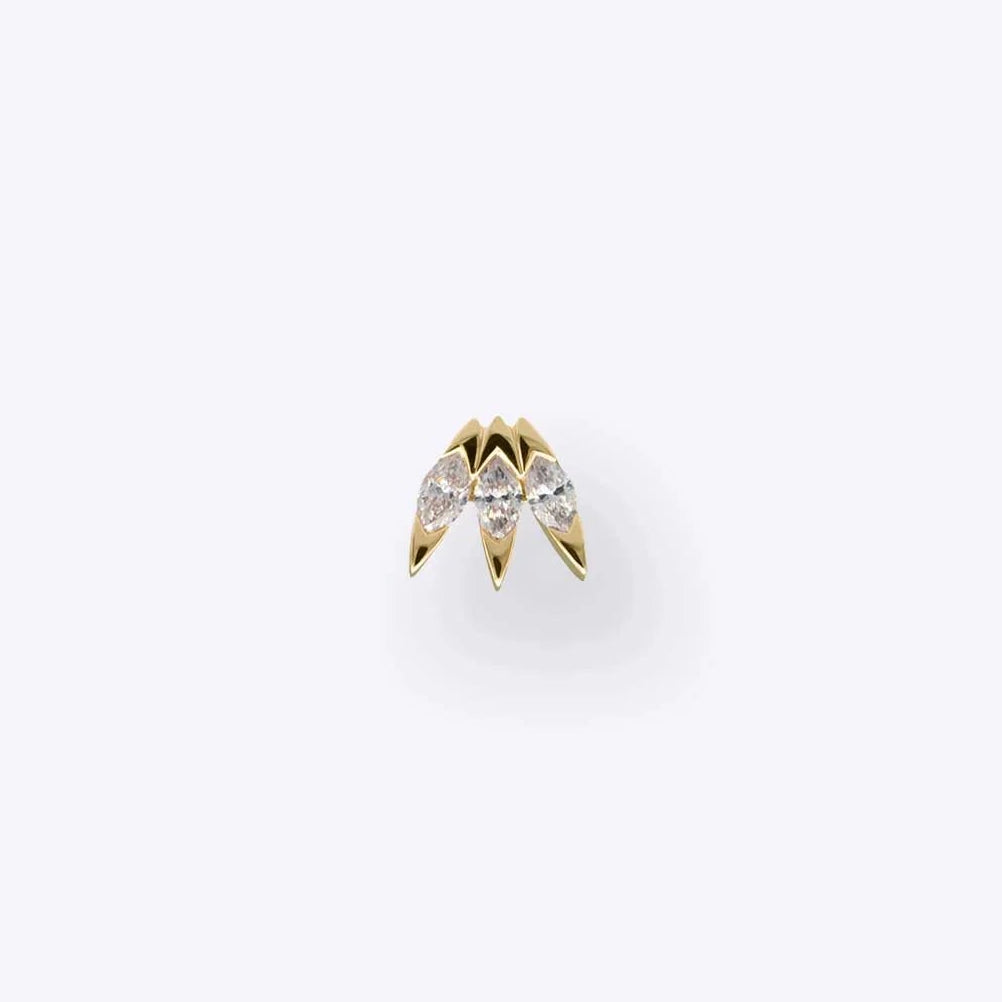 Behold the Xanadu, a marvel wrought from 14K gold—a triple-gem marquise fan that seems to have sprung from the very dreams of the cosmos. Each of the three diamonds are cradled in a delicate embrace of elongated prongs that stretch toward infinity.