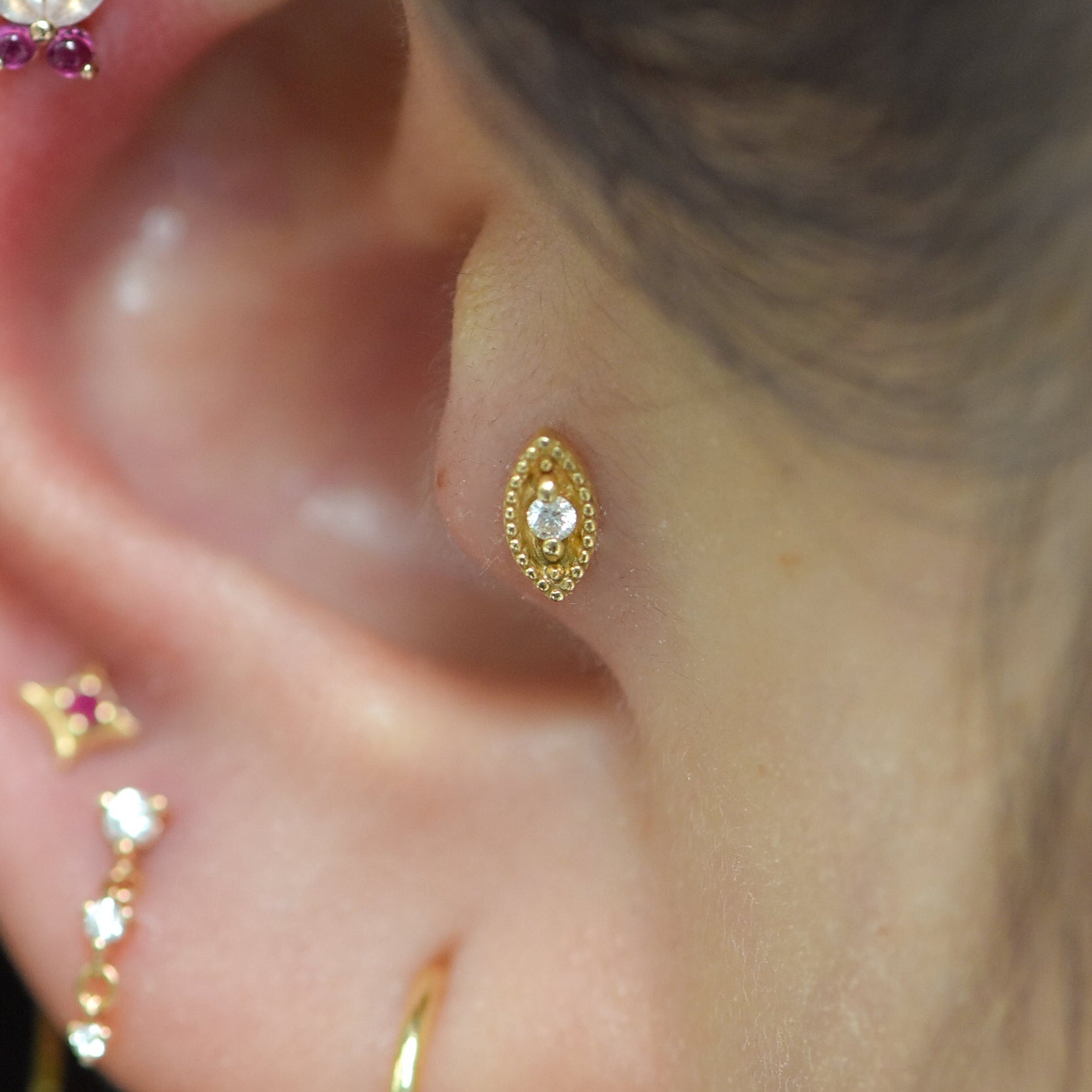 LeRoi's Millgrain Marquise ends are cast in-house, available in 14k & 18k yellow, rose, and white gold. A selection of colors is available for the 1.75mm hand set gemstone. Each piece has a superior hand polish and comes in either a threaded or threadless style.