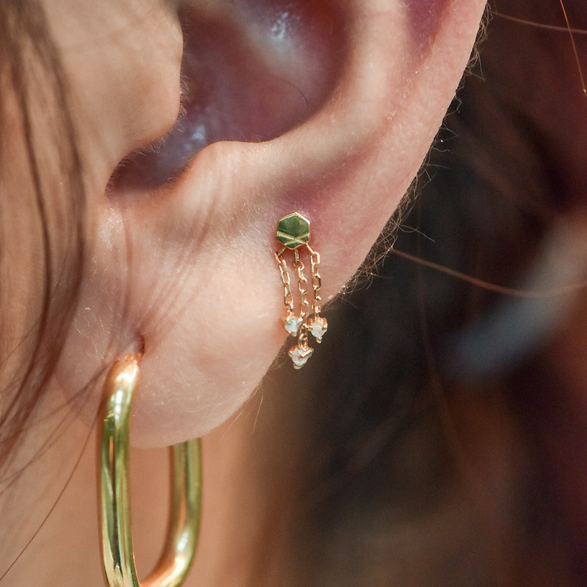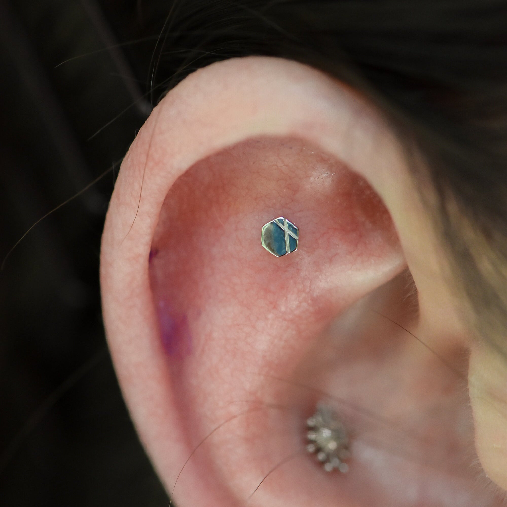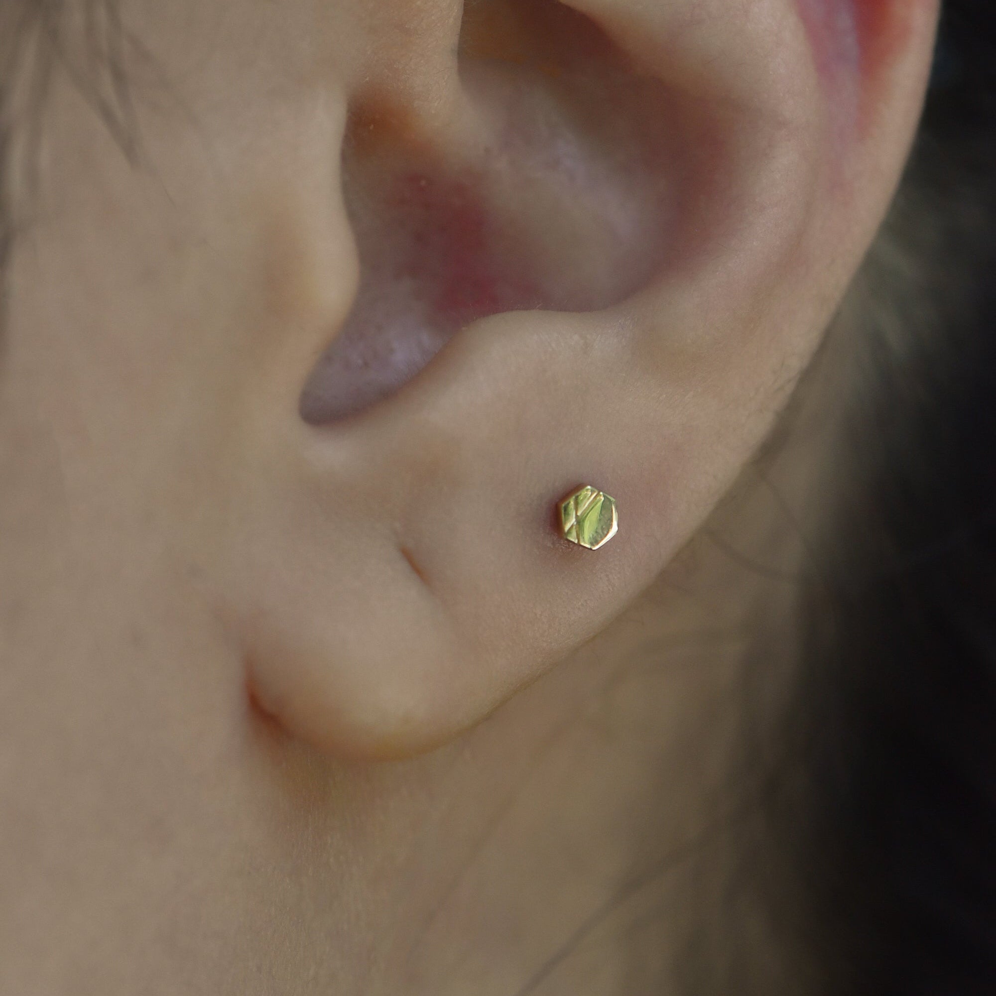 This subtle, flat hexagon is cast in solid 14k gold. It features 2 linear accents and would look great in a myriad of piercings.