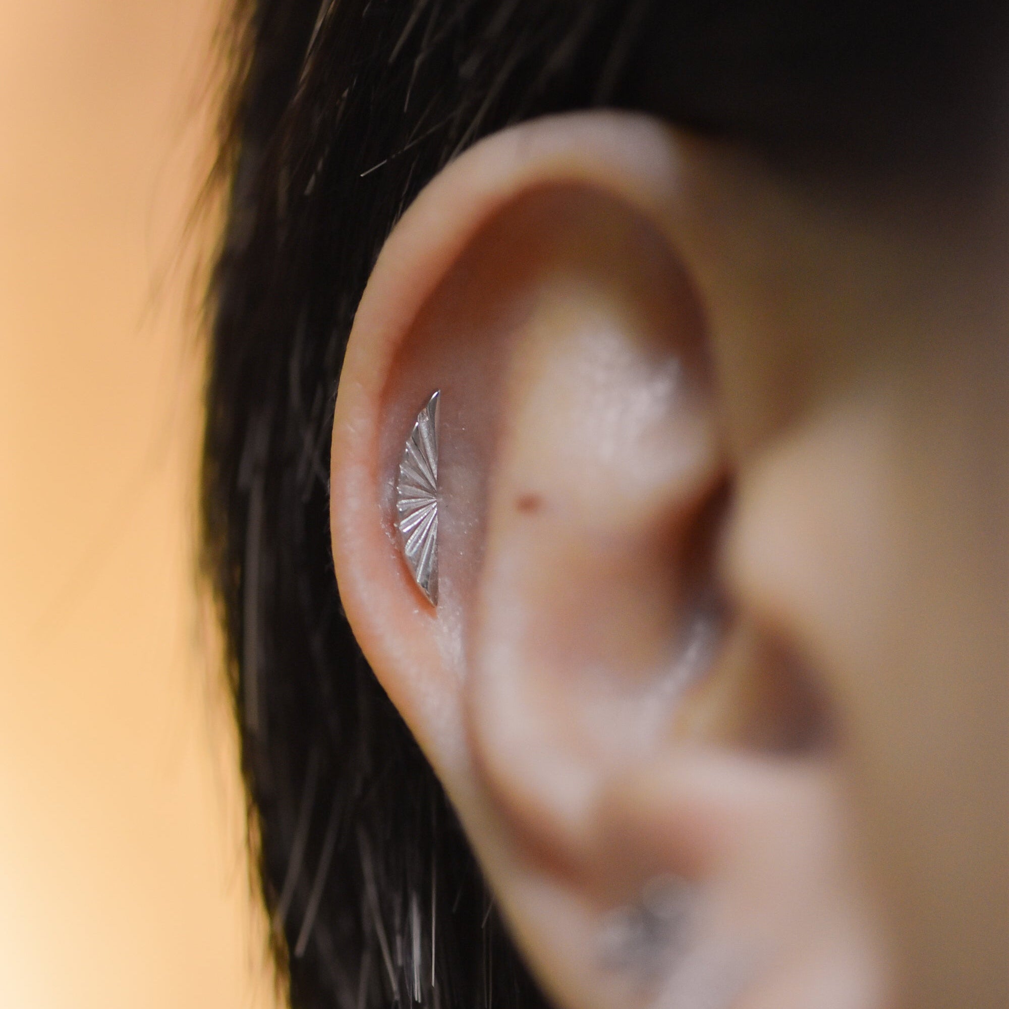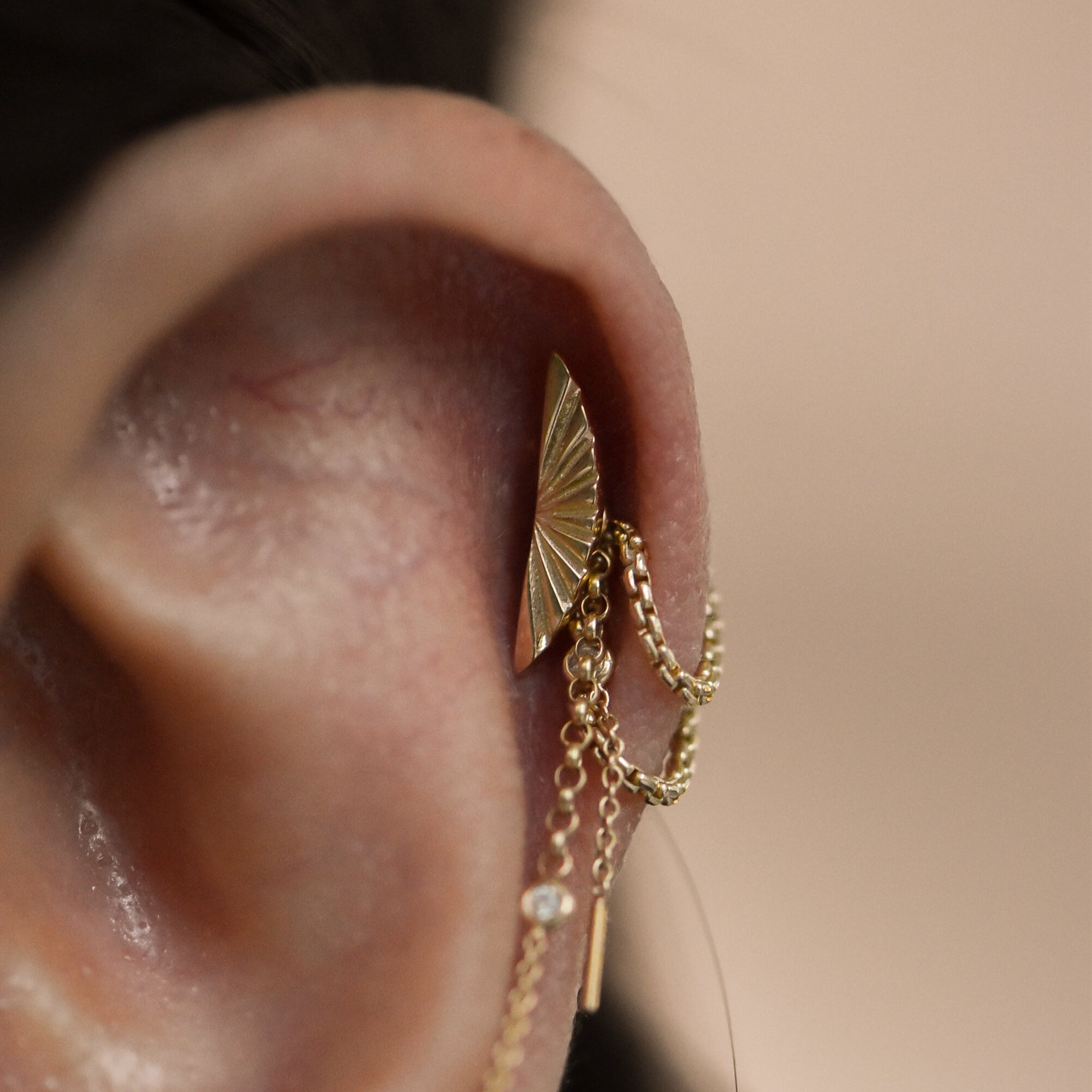 Horizon is a threadless 14K gold end evoking the vast expanse of alien landscapes. At 11mm in length, it mirrors the serenity of distant sunsets on uncharted worlds. When worn, Horizon has spellbinding beauty akin to a distant celestial sunset.
